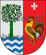 Otros: Escudo partido: 1º, en campo de plata, un árbol de sinople, sobre ondas de azur y plata, y 2º, en campo de gules, un gallo de su color natural, y, en jefe, una flor de lis de plata.