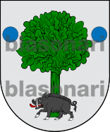 Otros: En campo de oro, un roble de sinople, y a su pie, un jabalí andante de su color natural y a cada lado, de la copa del árbol, un roel de azur.