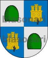 Otros Valaguer: Escudo cuartelado: 1º y 3º, en campo de plata, un monte de sinople, y 2º y 4º, en campo de azur, un castillo de oro, con un guerrero de sable, a su puerta.