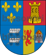 Escudo partido: 1º, en campo de oro, tres matas de carrizo de sinople, puestas en triángulo mayor, y 2º, en campo de sinople, cinco ruedas de carro de oro, puestas en sotuer. Bordura general: su mitad diestra, de gules, con ocho sotueres de oro, y su mitad siniestra, de azur, con ocho ruedas de carro de oro.