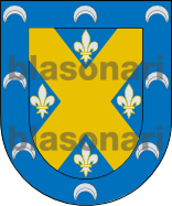 En campo de azur, un aspa, de oro, que toca son sus extremos los del escudo acompañada, en los huecos, de cuatro flores de lis, de plata, perfiladas de oro. Bordura de azur, con ocho crecientes, de plata.