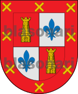 Otros traen: En campo de sinople, una banda, de plata, acompañada de dos torres donjonadas de oro, aclaradas de gules; bordura de oro, con cuatro cruces floreteadas de gules, puestas en los cantones.