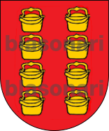 En campo de gules, ocho bezantes o marcos (monedas) de oro, puestos en dos palos.