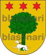 En oro, un árbol de sinople y un lebrel blanco atado al tronco con cadenas de hierro; en jefe, tres estrellas, de gules.