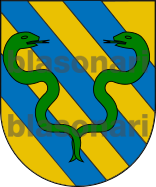 Otros: De oro, tres bandas de azur y, puestas en orla, dos sierpes afrontadas, con las colas entrelazadas.