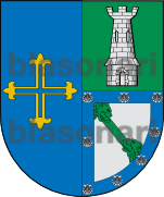 Otros traen: Escudo partido: 1º, en campo de azur, una cruz hueca floreteada, de oro, y 2º, en campo de sinople, una torre de plata; medio cortado de plata, con una banda de sinople, engolada en dragantes del mismo color; bordura de azur con ocho veneras de plata.