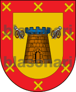 En campo de oro, una torre parda, almenada con su homenaje y capitel de azur, acostada de dos cañones al natural, uno a cada lado. Bordura de gules, con ocho aspas de oro.